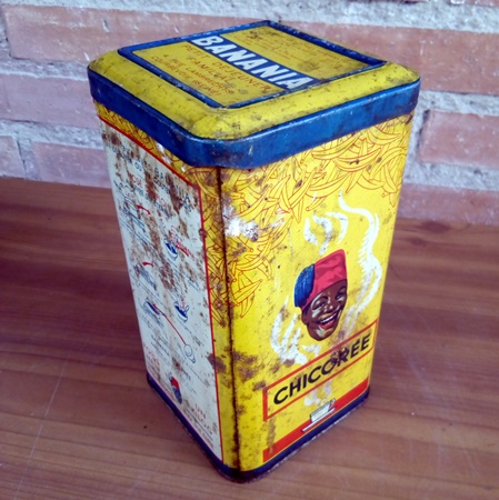 Bote de metal de chocolate soluble de la marca Banania producido por Courbevoie. Tiene el cartel de chicorée, para guardar posteriormente ese producto en el bote.Medidas:17,5x 9,5x 9,5cm. Utilizado en los años 30.