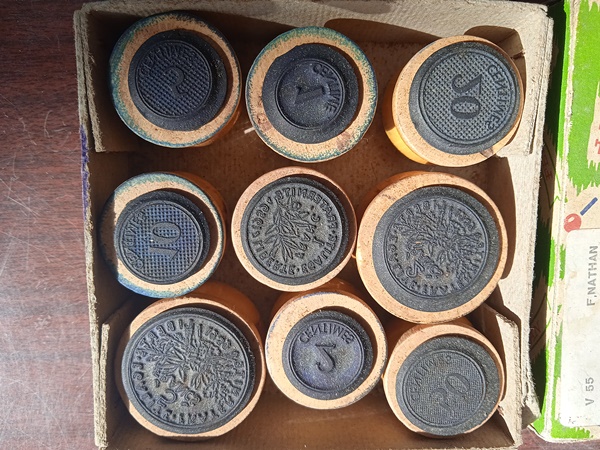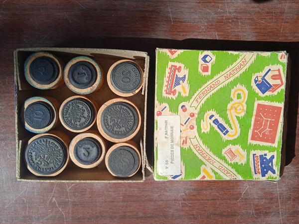 Cuños o tampones de monedas francesas años 50, de la marca Fernand Nathan, con su caja original, en total 9, utilizados para la enseñanza escolar.