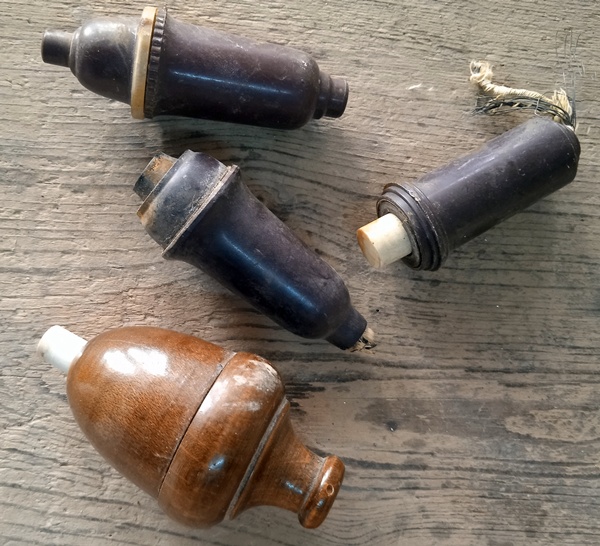 Lote de peras interruptores, tres de baquelita, y una de madera.