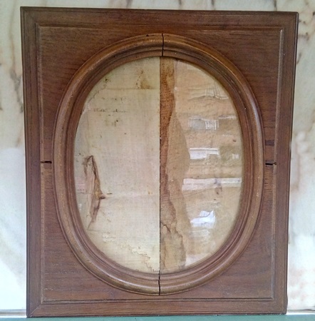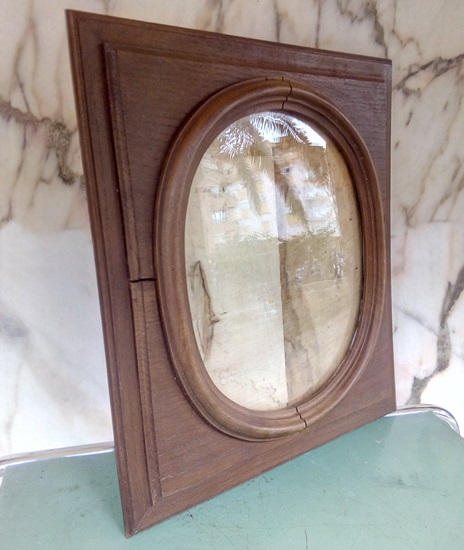 Marco para fotos, tallado en madera noble ovalada la parte interior, y en la parte exterior rectangular. Medidas: 44 x 50 x 4cm.
