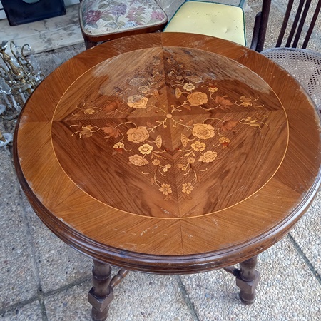 Mesa clásica de madera con marqueteria redonda con círculo de refuerzo en la parte inferior. Necesita un restaurado en la parte superior, y tiene algunos agujeros inactivos de carcoma en las patas. Medidas: 75 x 80cm de diámetro.