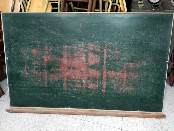 Pizarra antigua de escuela con desgaste en la pintura realizada en madera. Aproximadamente de los años 50-70. Medidas: 94 x 150,5cm.
